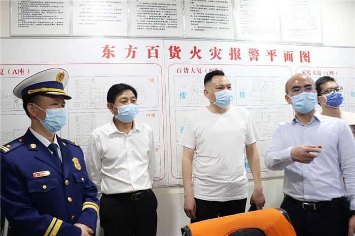 在地下监控室,江区长认真查看了智能监控系统设施设备及运行情况,对东方百货严格落实安全生产责任机制,健全完善安全生产监管体系,持续深入开展隐患排查工作表示了认可。并强调,要认真做好消防设施检查、人员培训和各项应急演练,为市民营造安全、有序、放心的消费环境。