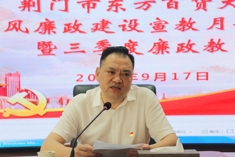 随后,公司党委副书记、纪委书记金柱平同志宣讲《2021年荆门市东方百货党风廉政建设宣传教育月活动方案》,安排部署本企业党风廉政建设宣传教育月相关工作,重温党章和《中国共产党纪律处分条例》《中华人民共和国监察法》等党内法规,带领大家学习《中共中央关于加强对“一把手”和领导班子监督的意见》及市纪委通报的四起严重违纪违法问题典型案例,并结合公司的党风廉政宣教月活动作工作部署,他指出,全体党员干部充分认识党风廉政建设的重要性和必要性,切实加强党风廉政建设;扎实好党风廉政建设宣教月活动,夯实廉洁从政思想基础。全市开展以“创清廉荆门 树新风正气”为主题的廉政宣教月部署会议,是对我们党员干部心志的一次磨砺,灵魂的一次洗礼。希望全体党员干部认清形势、提高认识、落实责任、开拓进取,瞄准公司全年目标,深入落实全面从严治党新部署新要求,为开创公司高质量发展新局面提供坚强的政治保障。