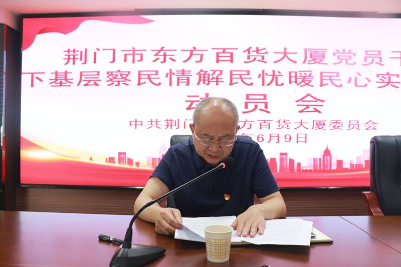 会议最后,东方百货党委书记、总经理张兴平同志宣读荆门市东方百货大厦党员干部下基层察民情解民忧暖民心实践活动方案,并做动员讲话。他强调,各部门要按照中央、省委、市委的统一部署,走好新时代党的群众路线,深入基层一线,面对面、心贴心、实打实,用心用情用力用爱去服务群众,切实推动下基层察民情解民忧暖民心实践活动走深走实。