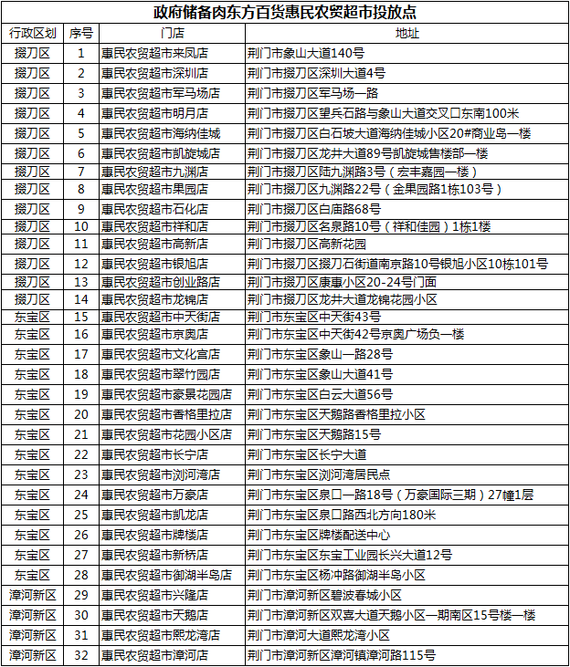 据悉,本次政府投放的储备猪肉为生鲜猪肉,由政府储备肉承储企业当日生产,请广大市民有序排队、放心购买。投放分两批实施,第一批计划投放60吨,时间为9月11日至16日;第二批计划投放100吨,时间为9月30日至10月8日。第一批在中心城区32家东方百货惠民农贸超市设立储备肉投放点(具体投放点见附表);第二批投放地点根据第一批投放情况适量调整。