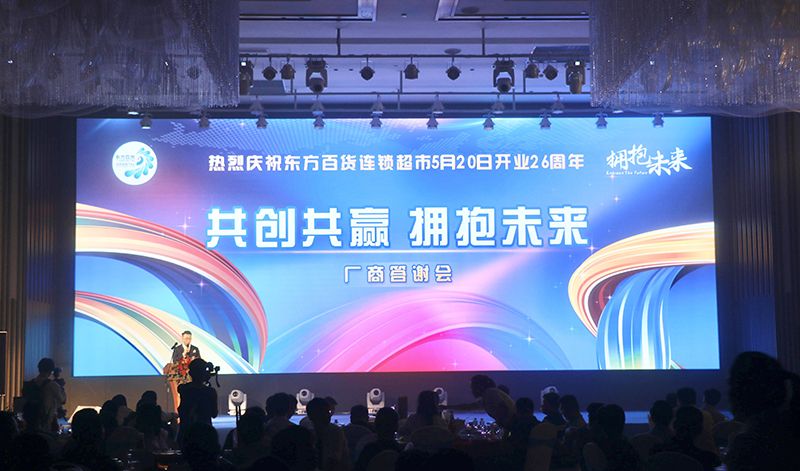 5月19日晚,以“共创共赢 拥抱未来”为主题的东方百货第26届超市庆暨厂商答谢会在蓝洋林顿酒店盛大开幕,东方百货中层及以上管理干部、各大品牌厂商代表近200人相聚与此,大家共叙行业情谊、共谋合作发展、共展希望未来。