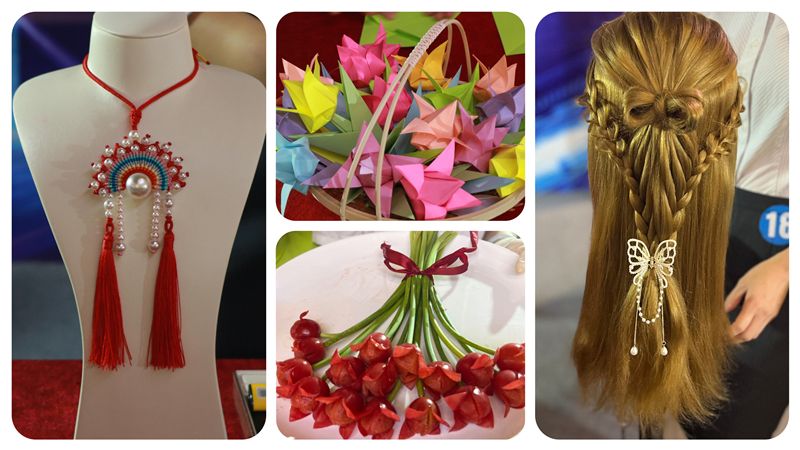 (上图为花样编织、花样折纸、创意水果花、花样编发技能展示)